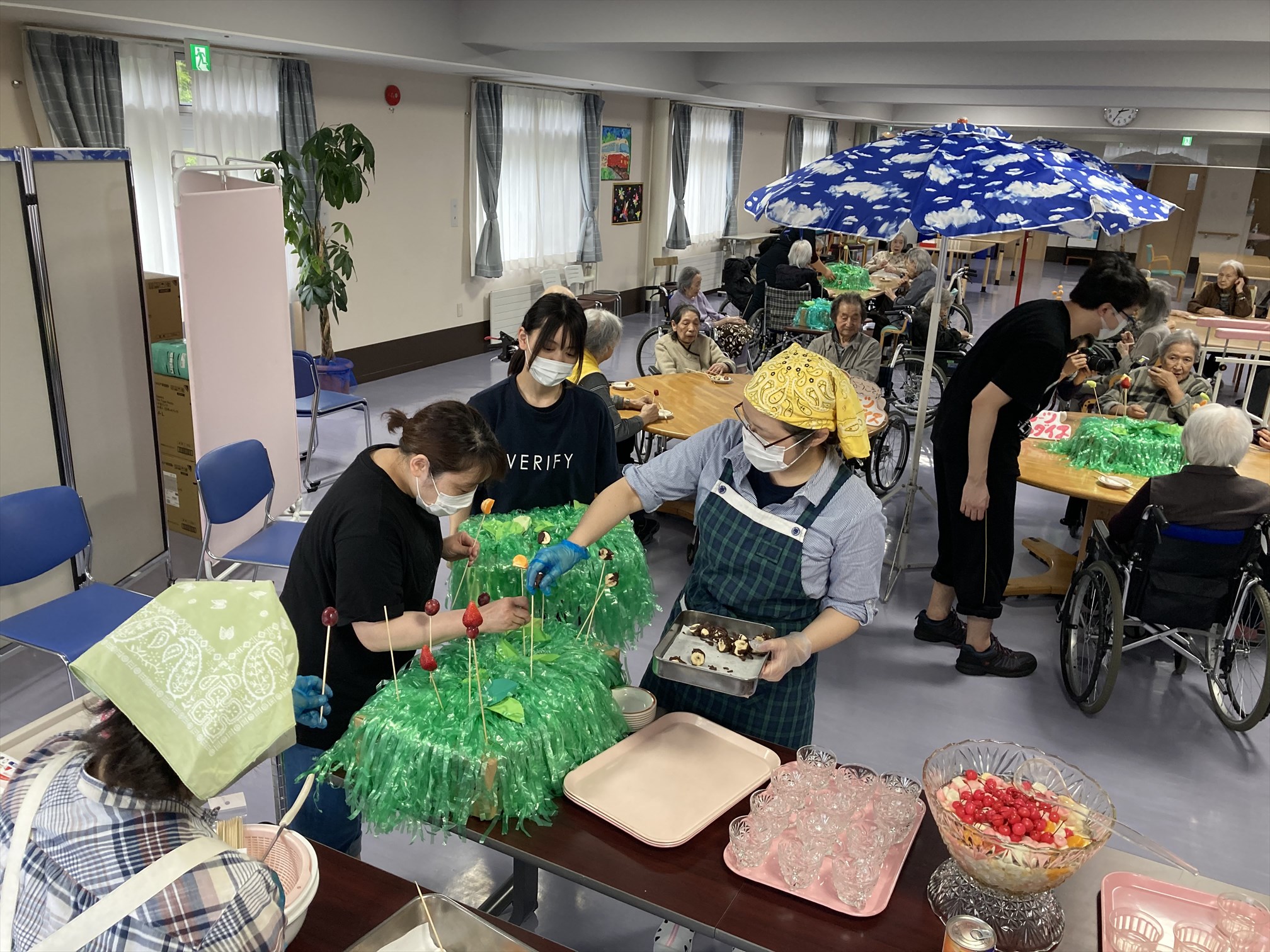 食べやすい大きさにカットしたフルーツを串に刺し、それをボール箱に刺して、ご利用者に好きに取っていただくスタイルにしました。また夏の気分を味わえるよう、パラソルも設置!飾り付けも頑張りました。