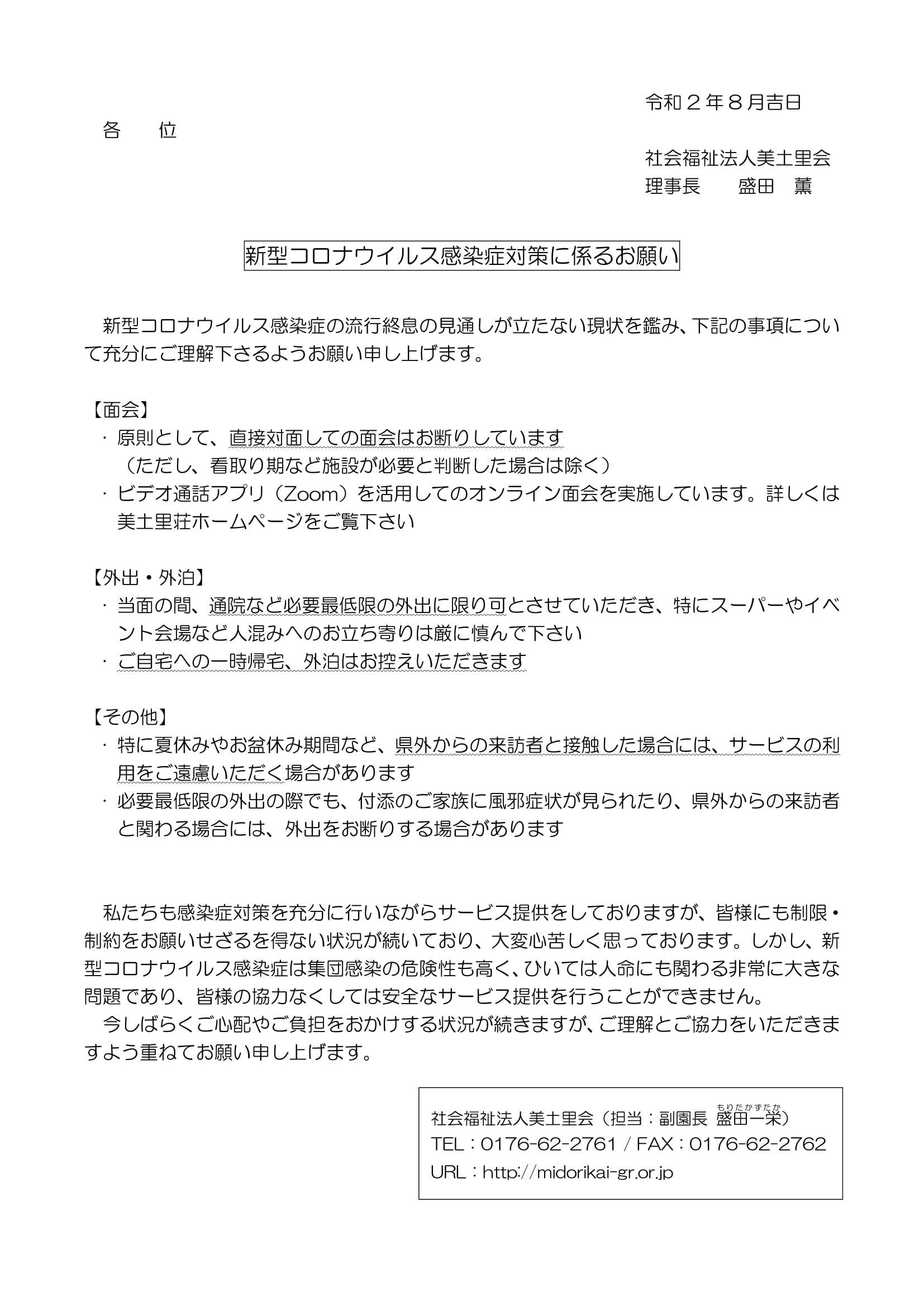 美土里会からお知らせ 新型コロナウイルス感染症対策に係るお願い 新型コロナウイルス感染症対策につきまして、今まで口頭などでお伝え・お願いしていたところでありますが、流行終息の見通しが立たない現状を鑑み、別添の通り改めてお願いいたします。 皆様には多大なご迷惑やご心配をおかけしますが、なにとぞご理解・ご協力いただきますよう重ねてお願い申し上げます。 ※PDFファイルをご希望の方はこちら ※オンライン面会についての詳細はこちら 前へ 2019年度財務状況を公開しました 次へ 美土里会日記『新しい住人が?』を公開しました お知らせ一覧へ