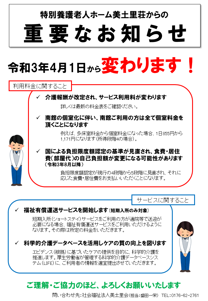 介護報酬改定に伴う特別養護老人ホーム美土里荘並びに美土里荘短期入所生活介護事業所(ショートステイ)の料金・体制につきましてアップロードしました。